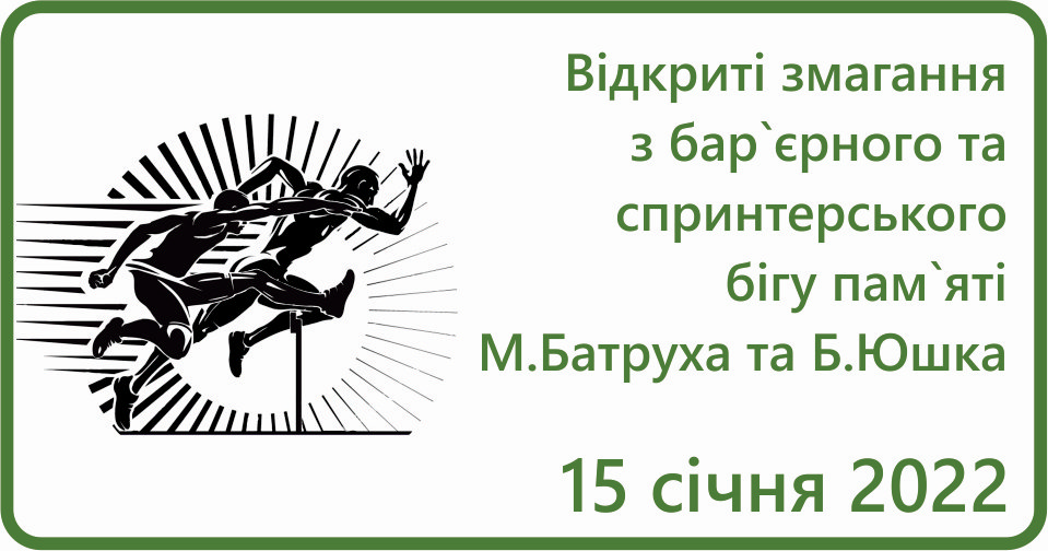 Відкриті змагання з бар`єрного та спринтерського бігу пам`яті М.Батруха та Б.ЮшкаBy kostritsky / 15 January 2022 Дата: 15 січня 2022 рокуМісце: манеж КМШВСМ (пр. Тичини 18) Регламент змаганьРозклад змагань Результати змагань