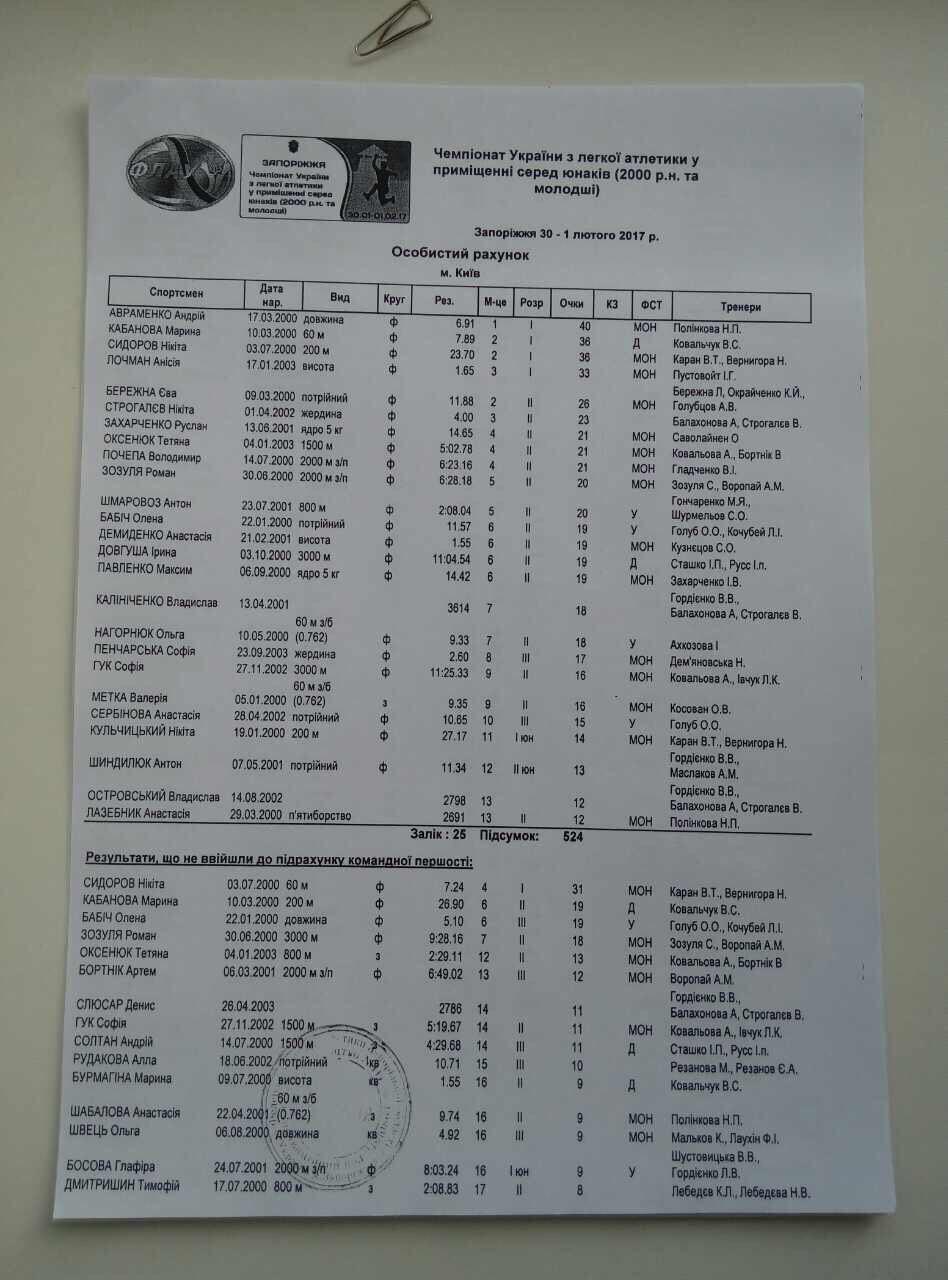 Команда міста Києва, набравши 540 очок, зайняла 4-тє місце на чемпіонаті України серед юнаків (2000 р.н. та мол.) у приміщенні (м. Запоріжжя, 30 січня – 1 лютого 2017 р.).