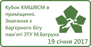 Кубок КМШВСМ в приміщенні. Змагання з бар’єрного бігу пам’яті ЗТУ М.БатрухаBy kostritsky / 19 January 2017 Дата: 19 січня 2017 року Місце: манеж КМШВСМ (пр. Тичини 18) Регламент змагань Розклад змагань Результати змагань